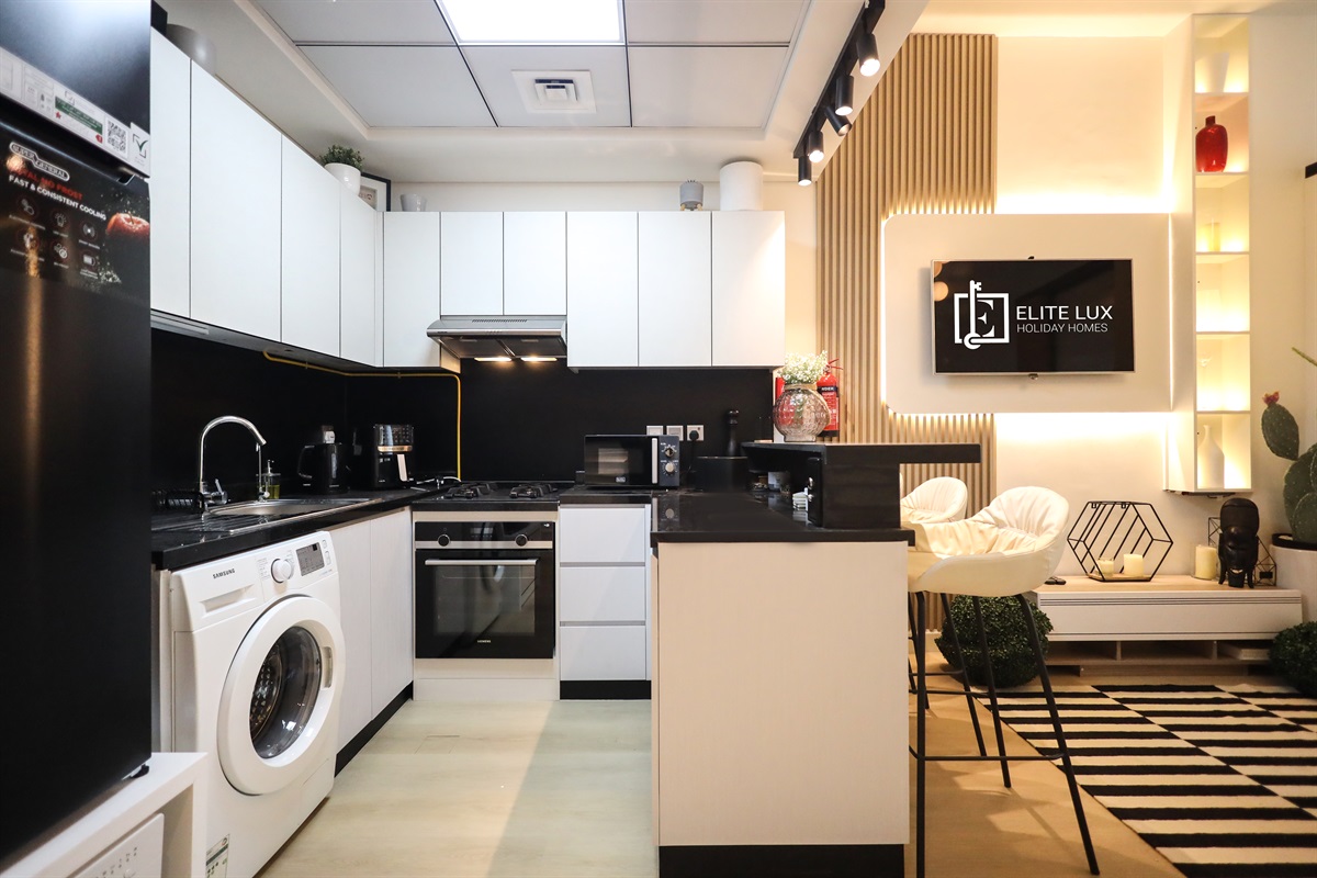 The fully equipped kitchen includes essential appliances, cookware, and dining essentials, making it easy to prepare home-cooked meals. A washing machine is also provided for added comfort during longer stays.