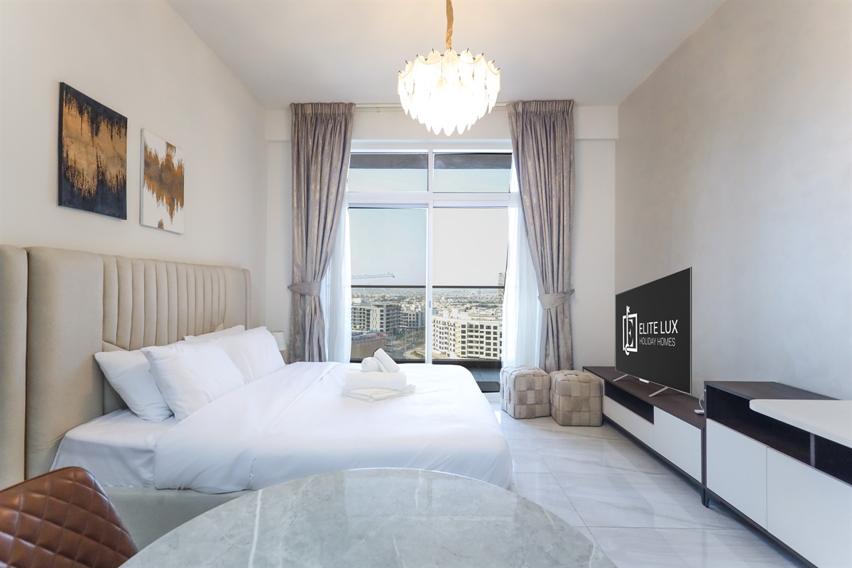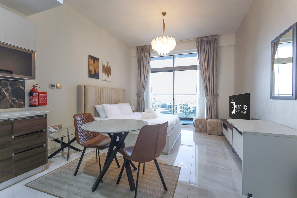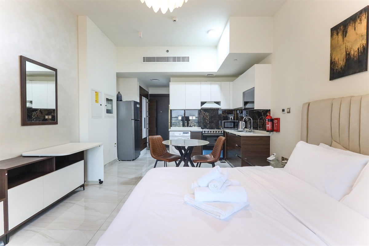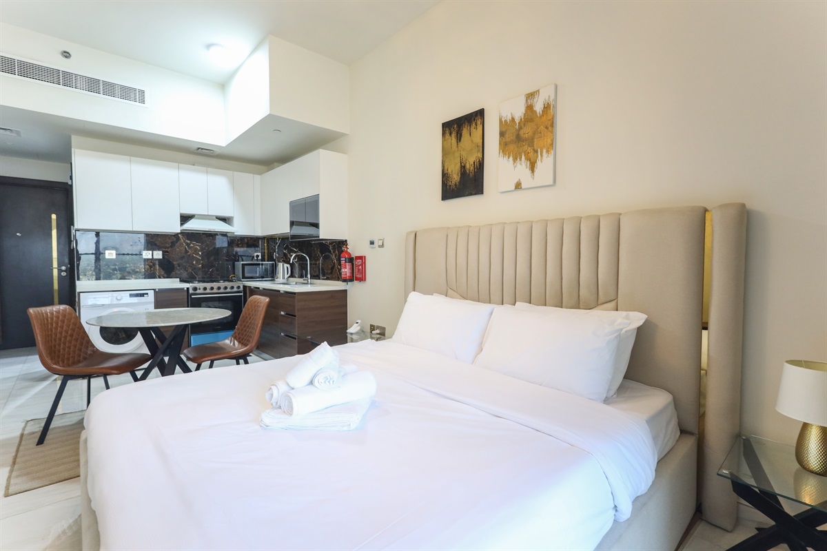 The main living area is smartly arranged to maximize space and comfort. A luxurious king-size bed promises restful nights, while the dining table creates the perfect setting for meals, remote work, or coffee breaks. A Smart TV and high-speed Wi-Fi ensure seamless entertainment and productivity throughout your stay.